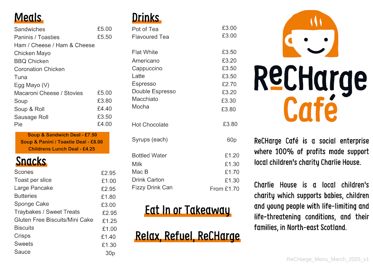 Welcome to ReCHarge Cafe, a delightful escape nestled in the Bon Accord Shopping Centre, Aberdeen. Here, flavor meets comfort in an inviting atmosphere perfect for a quick meal or a leisurely chat. The menu boasts an array of affordable and satisfying options, including freshly made sandwiches and hearty paninis, all priced around £5.00 to £5.50. For something warm, try their delicious soups or a classic sausage roll, ideal for a cozy lunch.